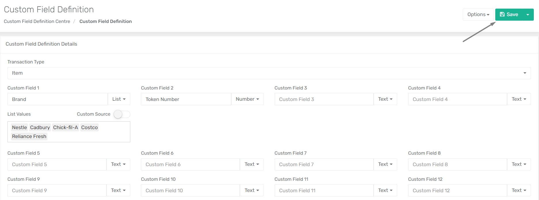 Once all the custom fields have been defined for a transaction, click on "**Save**" to create the custom fields.&#x20;