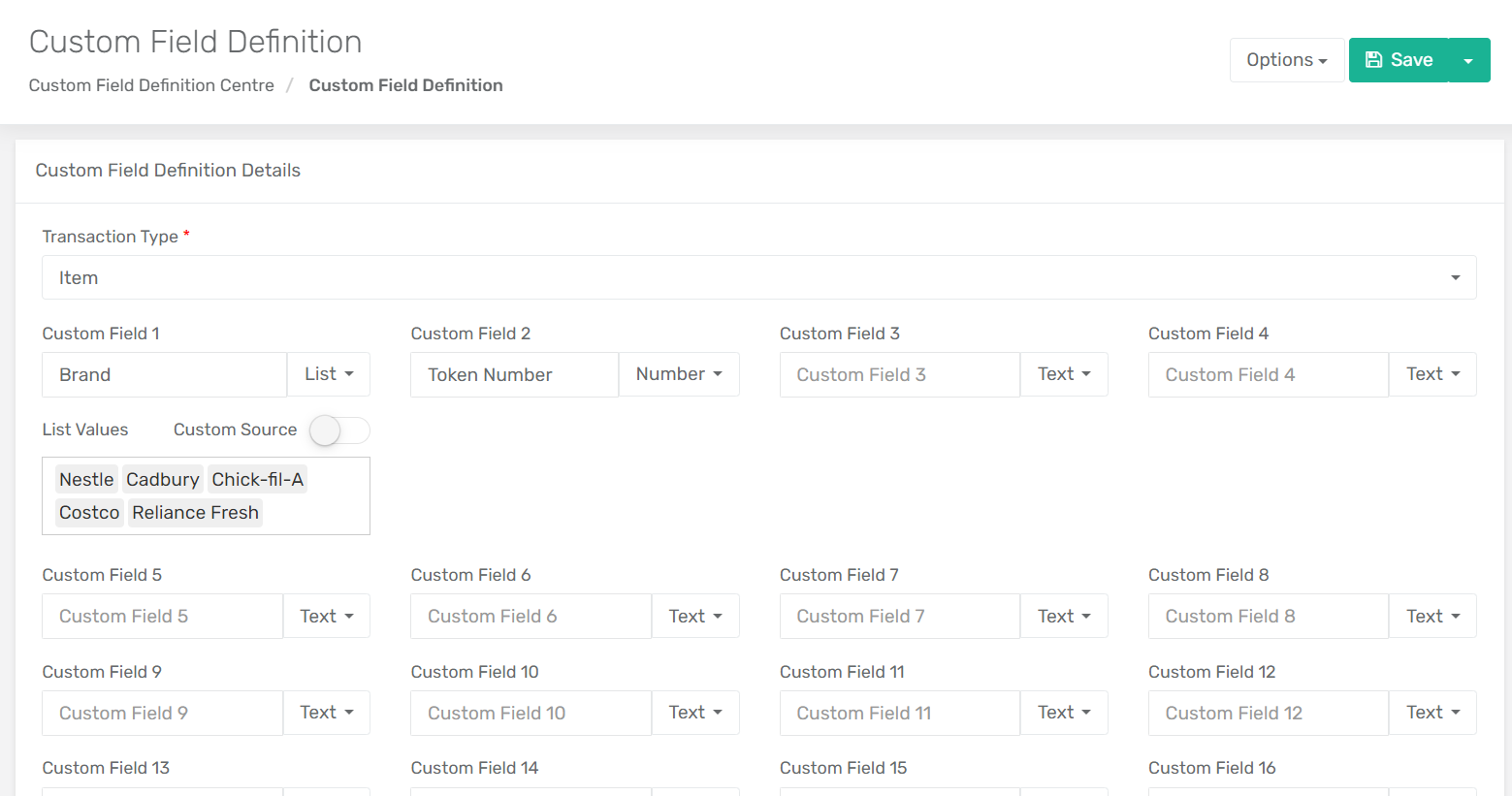 When creating a custom field, you will begin by defining the transaction type, then enter the field name and define the values accepted for the field.