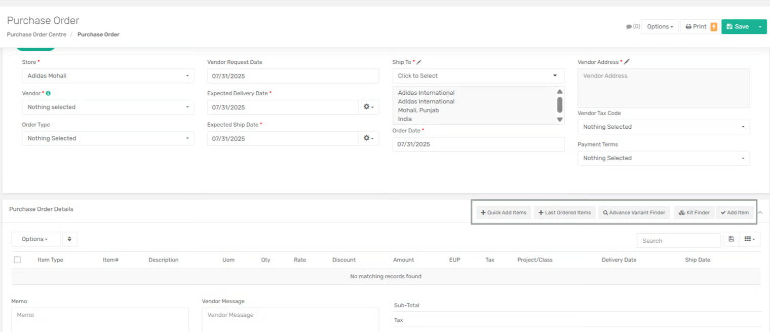 * **Add Item:** Allows you to quickly add new item(s) to the purchase order.